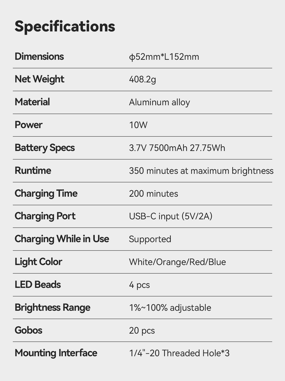 Runtime: 350 minutes at maximum brightness